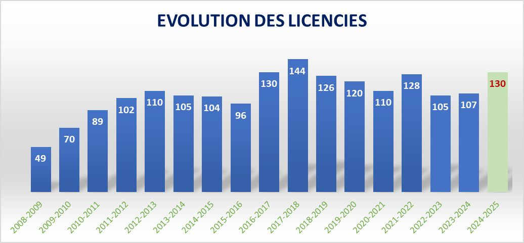 Après cinq années d’existence le Club comptais 110 licenciés pour atteindre 144 licenciés en 2017/2018 !